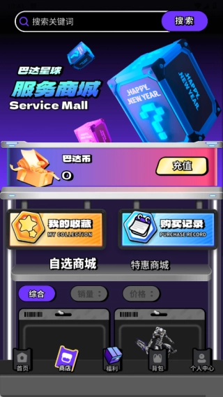 2、商店页面设有自选商城与特惠商品板块,在这里还能查看我的收藏及购买记录。