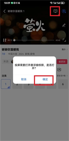 2、在界面里点击播放视频的区域后,右上角会出现【tv】标志,点击该标志即可进行投屏操作,但需先完成授权步骤,点击【确定】按钮来授予软件相应权限。