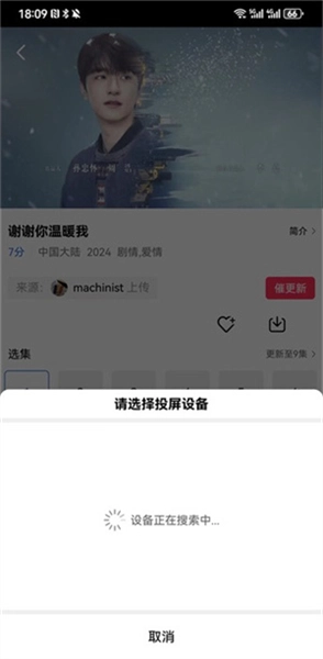 5、回到软件的剧集播放界面后,再次点击【tv】按钮就能启动投屏功能,待搜索到可用的投屏设备,即可完成投屏连接。