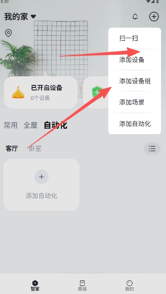 1、在智家页面,可选择添加设备或添加设备组来完成立林智慧生活设备的添加操作。