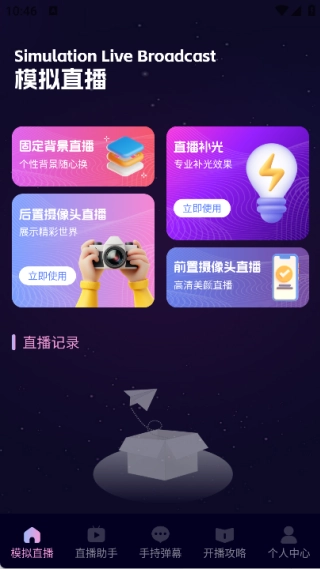 1、模拟直播页面具备固定背景直播、直播补光、后置摄像头直播以及前置摄像头直播等功能。
