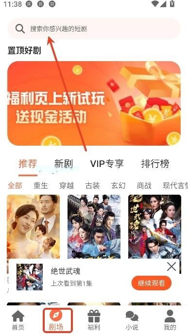 2、进入页面选择喜欢的短剧或点击上方的搜索框