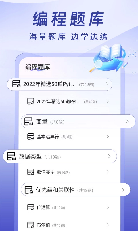 题库里包含多种不同类型的题目集合,用户能够随时挑选对应的题目集合开展练习。