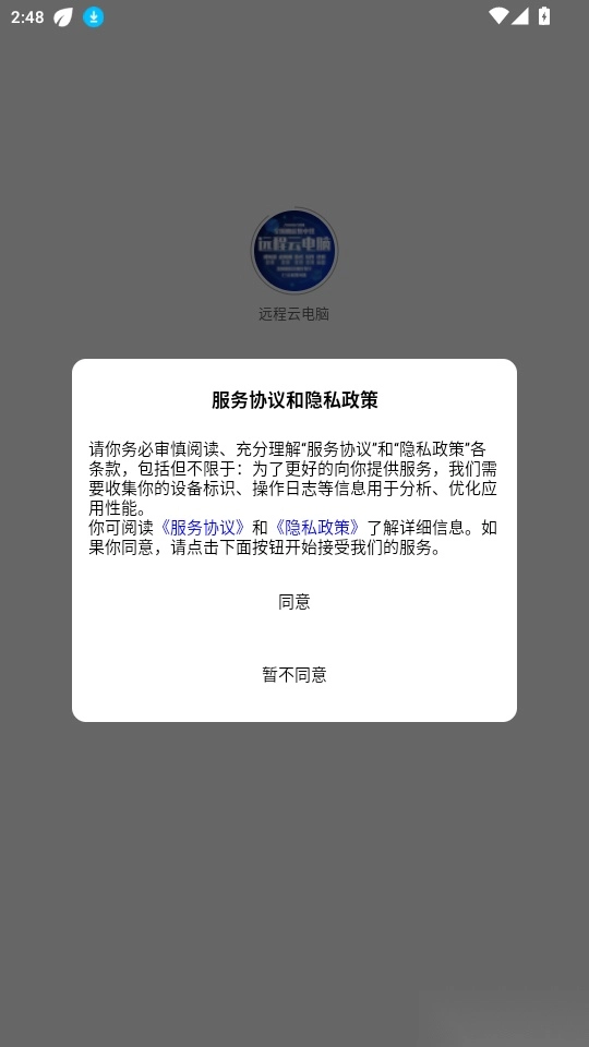 1. 启动软件后阅读“服务协议和隐私政策”,点击“同意”按钮进入下一步。