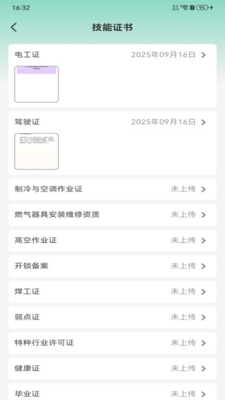 1、支持上传与查看电工证、驾驶证等多种技能证书,并能清晰展示已上传和未上传的证书状态。