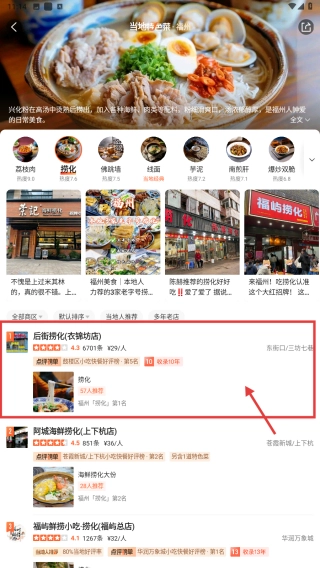 3、在美食分类列表里,点击像锅边这样的目标美食类型,就能进入该类型的美食商家列表页面。