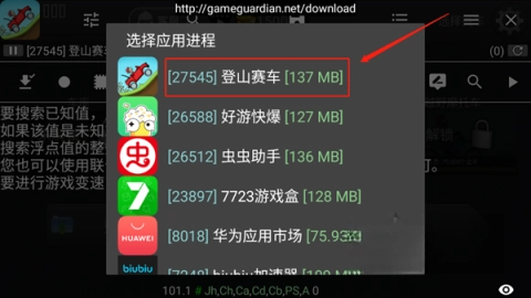 5、点击h5gg悬浮窗,选择《登山赛车》。