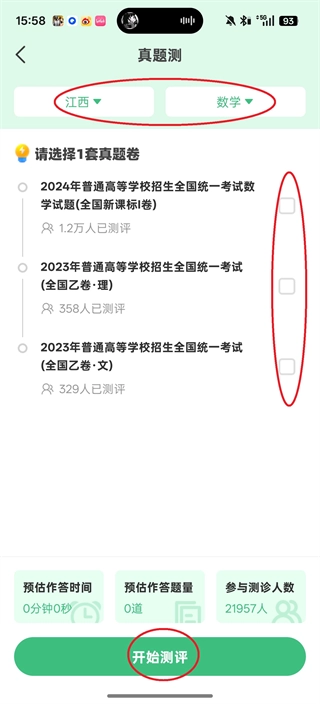3、选择省份以及科目,再选择高考真卷的年份,最后点击屏幕下方的“开始测评”。