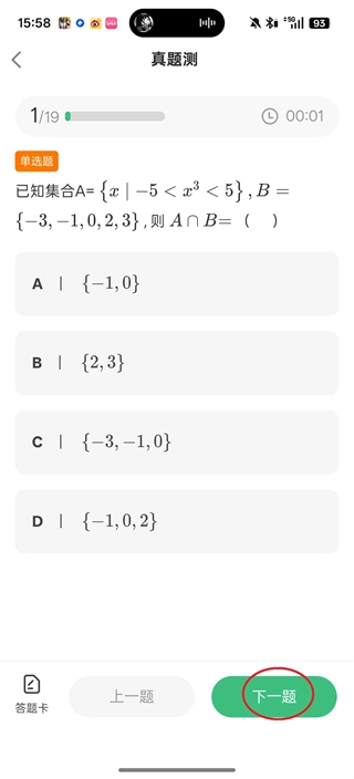 4、完成选项后,点击屏幕右下角的“下一题”。