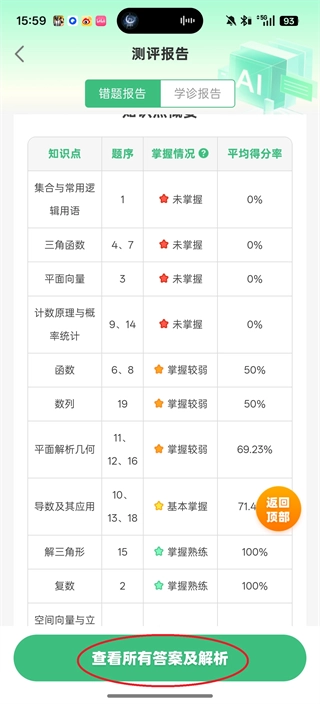 7、完成所有题目后,可以查看各个方面的薄弱方向,再进行专项训练,点击屏幕下方的“查看所有答案及解析”。