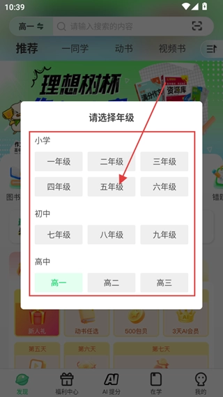 2、进入软件点击上方年级,进入选择界面,根据需求选择即可。