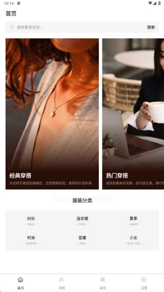 1、完成安装进入首页后,既能看到经典与热门的穿搭方案展示,也可借助服饰分类进行查看。