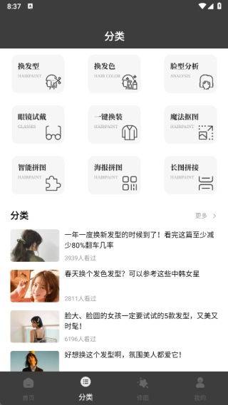 2、分类页面涵盖了换发型、换发色、一键换装、脸型分析、眼镜试戴、智能拼图、海报拼图等多样化功能;