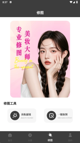 4、在修图页面中提供了美妆滤镜和一键抠图的功能。