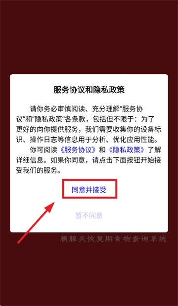 在本站安装并打开胰查通应用后,当出现服务协议与隐私政策的提示界面时,请点击同意并接受相关条款。