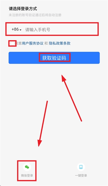 在登录页面输入手机号,勾选同意用户服务协议与隐私政策条款,点击获取验证码就能完成登录;若账号未注册,验证通过后会自动完成注册流程,此外也支持通过微信账号进行登录。