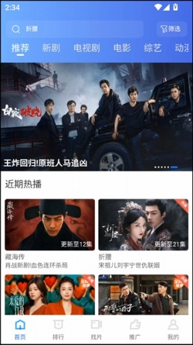 1、在软件首页,我们可以看到推荐、新剧、电视剧、电影、综艺、动漫等一系列板块。
