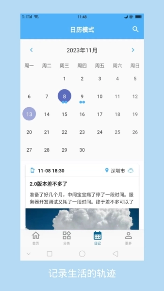 3.能够随时随地开展记录工作,拍摄好的视频可以即时添加到日记里,用户可以随时对这些内容进行查看与管理。