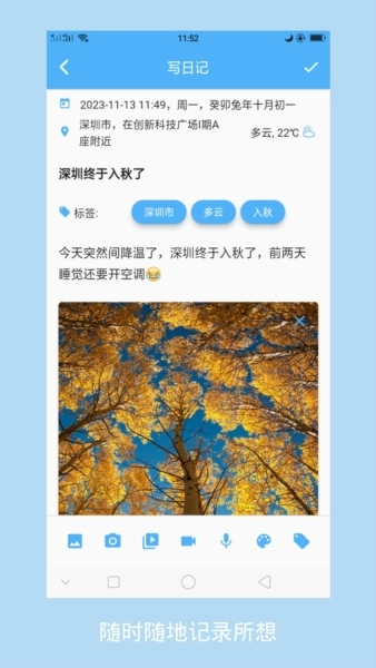 自动信息采集:日记会自动添加地理位置、天气等相关内容,用户也能自行进行修改。