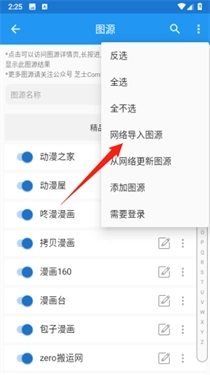 3、在图源管理中添加的步骤如下:点击“我的”→进入“图源”页面→点击右上角菜单→选择“网络导入图源”,后续操作与首页添加的流程一致。