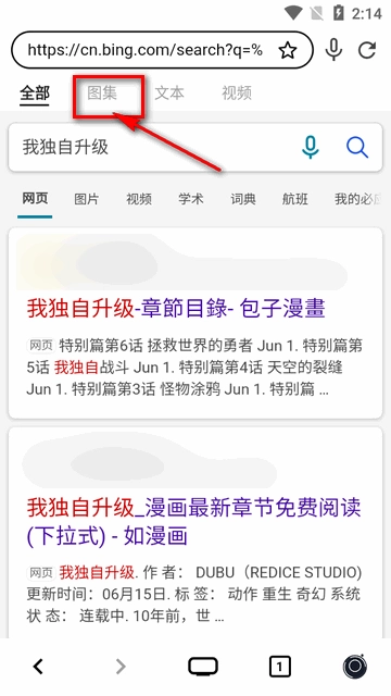 4、系统默认状态下会搜索全网范围内的内容,若选择“图集”选项,则会专门针对漫画内容进行搜索。