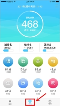 4、用户绑定学校后登录进入首页,点击底部的学情选项,就能查看学生各科目考试成绩。