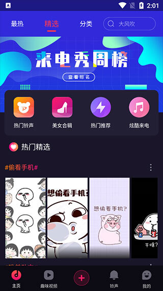4、登录好后可以在“主页”精选内,下拉滑动选择主题来电秀。