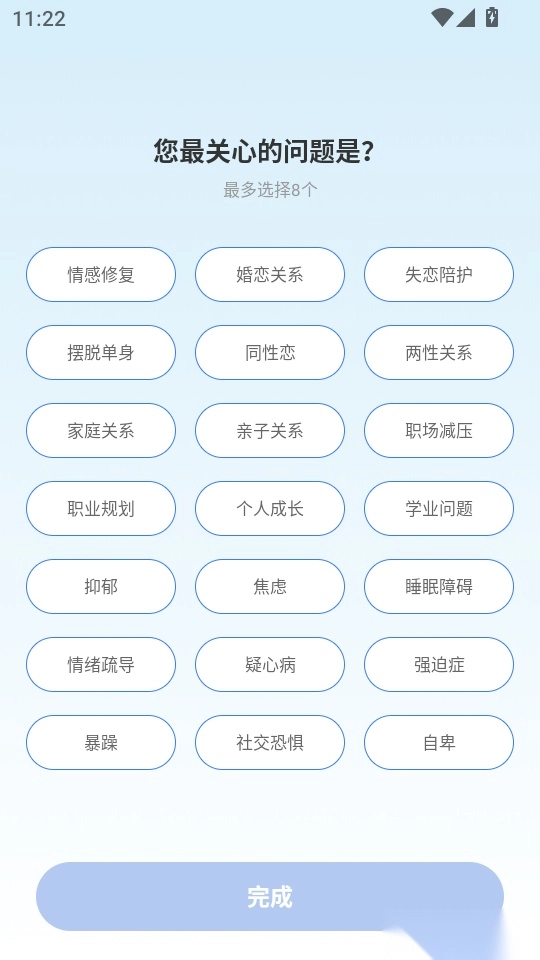 4. 接着进入“关心问题”的选择界面,选好问题后点击“完成”按钮,即可进入主界面