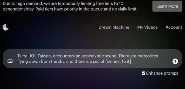 3、在输入指令框中直接上传图片,Luma AI会根据照片中的人物或场景自动生成更多动态影格画面。