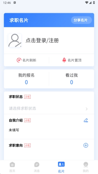 3、在名片页面,您能够查看自己的报名情况,填写求职状态、自我介绍以及求职意向等相关信息。