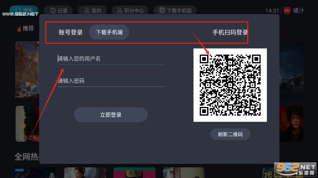 1、橘汁视频TV版账号登录可以使用用户名+密码的方式登录,也可以使用手机端扫码的方式登录。