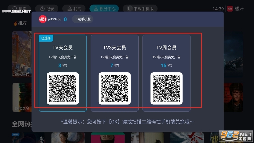 橘汁(安卓版),注册账号并获取积分(无门槛),然后用该账号登录电视版。 u200c