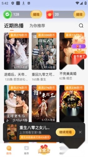 速看剧场是一款专注于短剧观看的应用,平台汇聚了极为多样的视频类型,海量丰富的短剧资源一应俱全。每天都会有众多短剧视频实时上新,用户能够借助关键词迅速检索到所需的影视内容,还能依据自身的网络状况挑选适宜的清晰度来观看剧集。