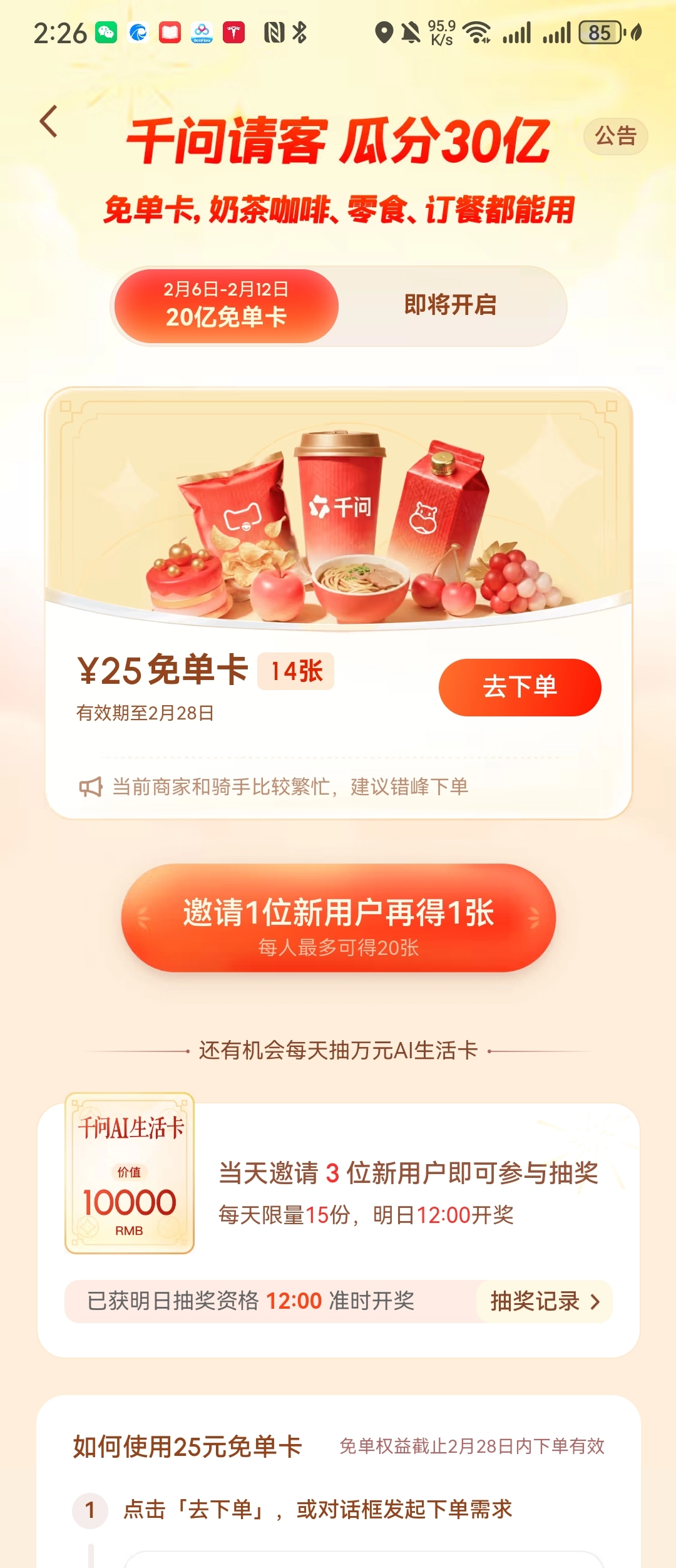要是你一天内成功邀请3位新朋友加入,还有机会抽取价值10000元的千问AI生活卡,说不定幸运就会降临到你头上!
