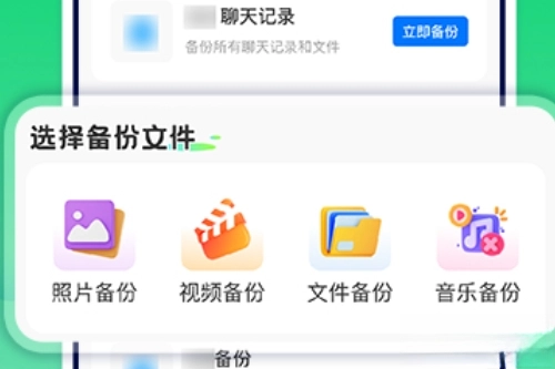 进入应用后,首页设有多种备份选项,涵盖微信/QQ聊天记录备份,以及照片、视频等多媒体文件的云端存储功能。
