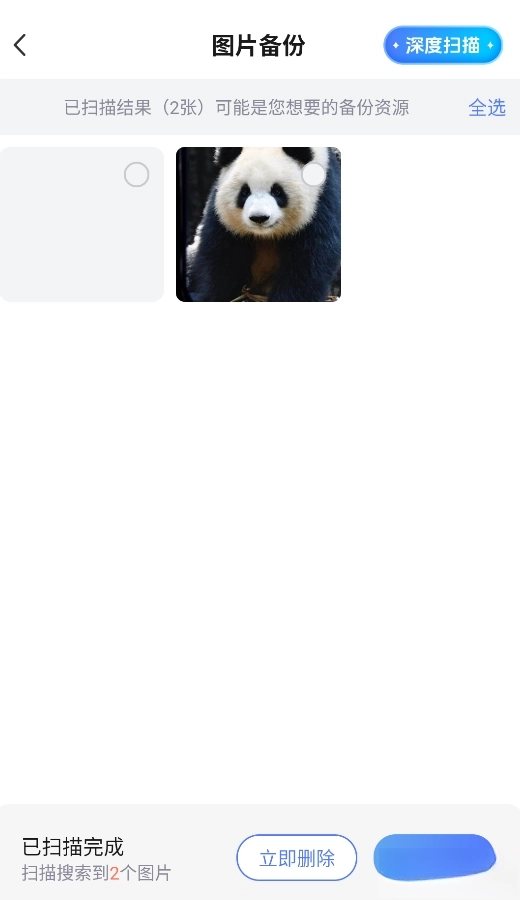 在照片备份模式下,开启深度扫描功能后,系统可检索设备内所有图片,用户能够选择性勾选重要照片来完成备份保存。