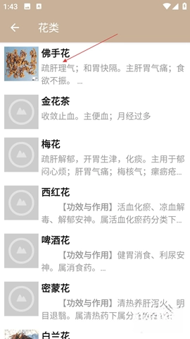 点击“花分类”选项即可进入花类中药材的专属页面,该页面中清晰罗列着佛手花、金花茶等多种花类药材。