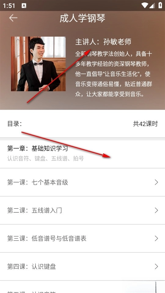 然后我们在钢琴教室页面找到可以直接开始学习的在线学琴课程。