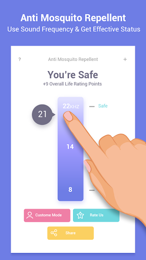 这款驱蚊应用程序能帮您避免被恼人的蚊子及其他令人不适的昆虫叮咬。它会发出一种昆虫厌恶的独特频率声波,这种声波频率极高,人类的耳朵无法察觉。该应用通过低频发射器来实现驱蚊效果,您可以在8千赫兹到22千赫兹的范围内选择频率,从而根据所处环境灵活调整使用。