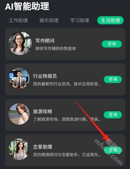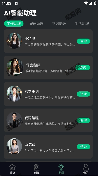 4、点击助理,选择一个你喜欢的助理类型点击咨询就能开始聊天