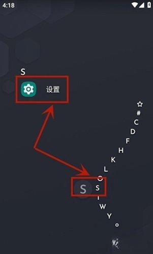在Niagara Launcher页面滑动右侧的字母栏到“S”,然后选择设置选项。