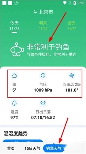 用户要是打算出门钓鱼,不妨打开钓鱼天气应用,这样就能知晓当天适不适合钓鱼了。