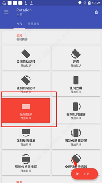 比如你想借助Rotation软件实现强制横屏,只需点击“强制横屏”选项,接着点击“开始”按钮即可。