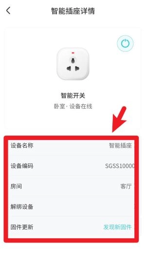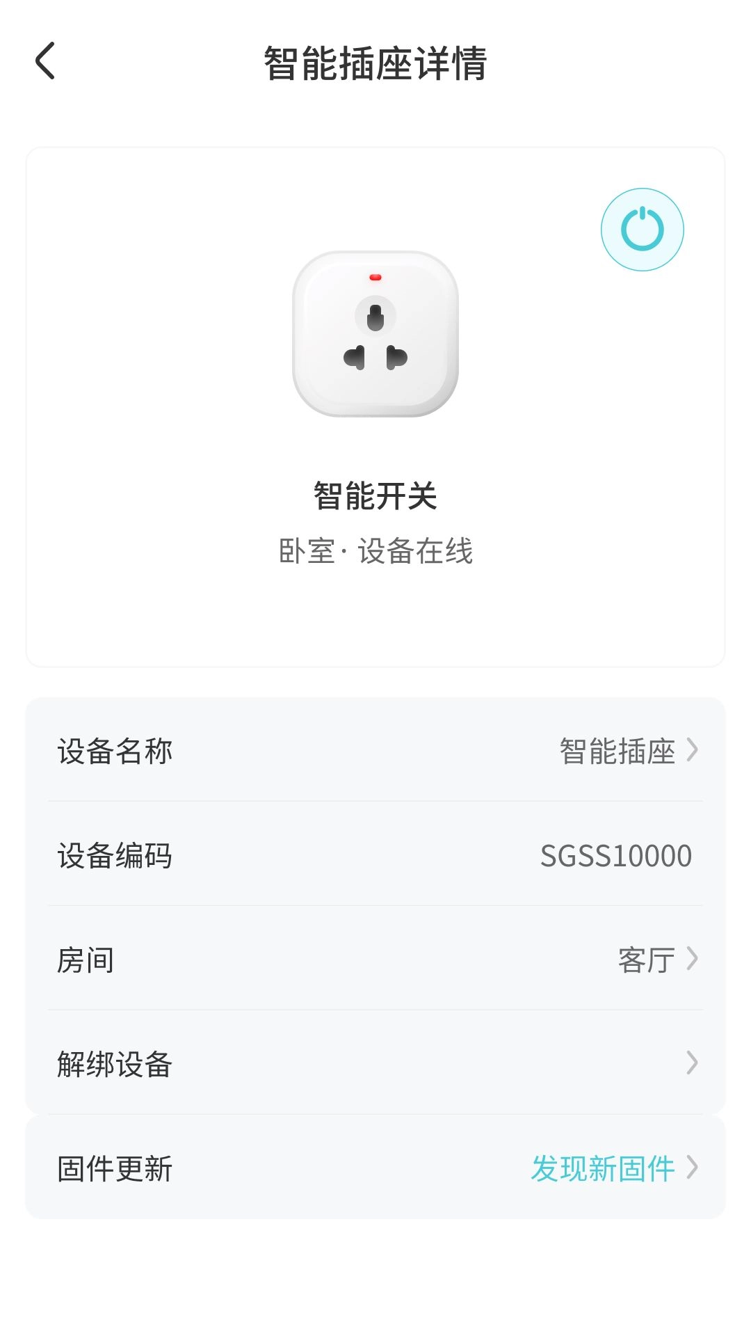 2、进入智能插座详情页后,可查看状态、修改房间、解绑设备及进行固件更新等操作。