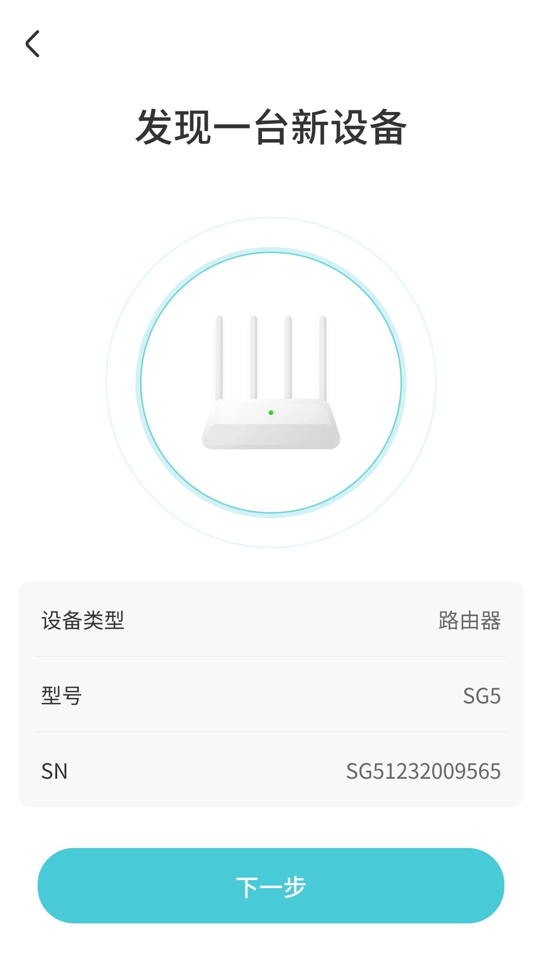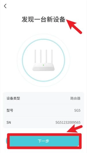 1、打开尚阁智能,系统发现新路由设备后,确认信息无误,点击页面底部“下一步”开始绑定操作。