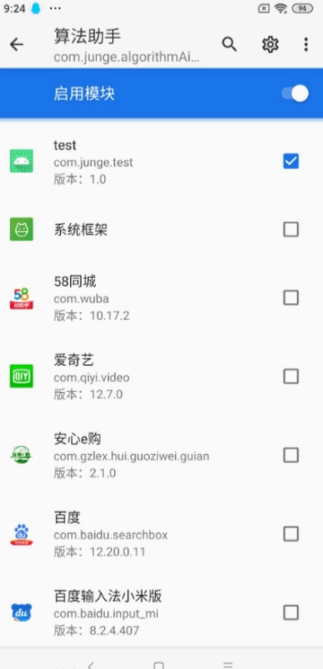 2、这边以Lsp框架为例子,启动算法助手模块,并在作用域中勾选你要Hook的App(经典Xposed只需要直接激活模块)