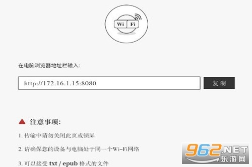 把电脑与手机连接到同一个WiFi网络,接着在电脑浏览器的地址栏输入http://172.16.1.15:8080,就能完成书籍导入操作。