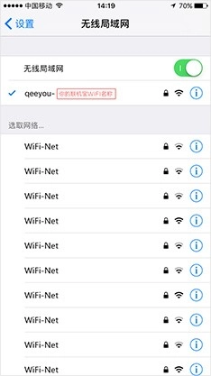 3、根据提示操作,开始设置手机WiFi连接至联机宝。联机宝的WiFi名称与初始密码均可在其外壳上找到,默认状态下,WiFi名称以“qeeyou”开头。为便于记忆,WiFi管理密码和设备管理密码是相同的。