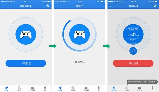 1、一键加速,轻松联机:打开应用,登录奇游账号后点击一键加速,仅需十秒即可完成联机。