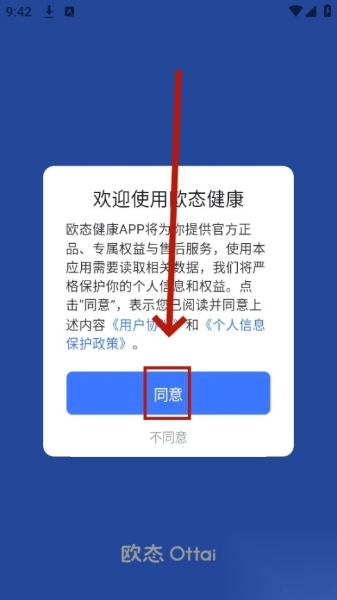 请先安装maitufit应用,安装完成后打开它,接着在弹出的相关提示中点击“同意”按钮。